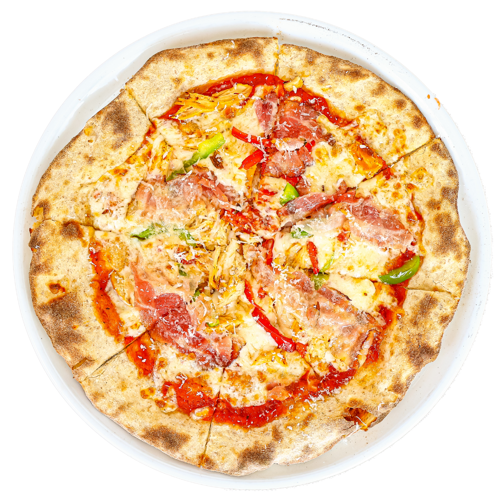 BACON, FRANGO ASSADO, PIMENTO E QUEIJO PARMESÃO