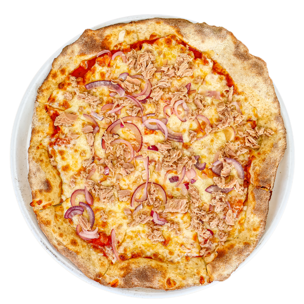 MOLHO TOMATE AROMATIZADO, QUEIJO MOZZARELLA, ATUM E CEBOLA ROXA